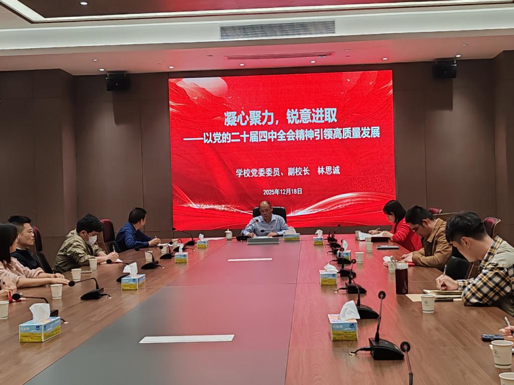 为深入学习宣传贯彻党的二十届四中全会精神,切实把思想和行动统一到党中央决策部署上来,12月18日下午,学校党委委员、副校长林思诚以《凝心聚力 锐意进取——以党的二十届四中全会精神引领高质量发展》为主题,在动物科技学院党支部讲授专题党课。支部全体党员参加学习,共同感悟全会精神实质,凝聚高质量发展共识。