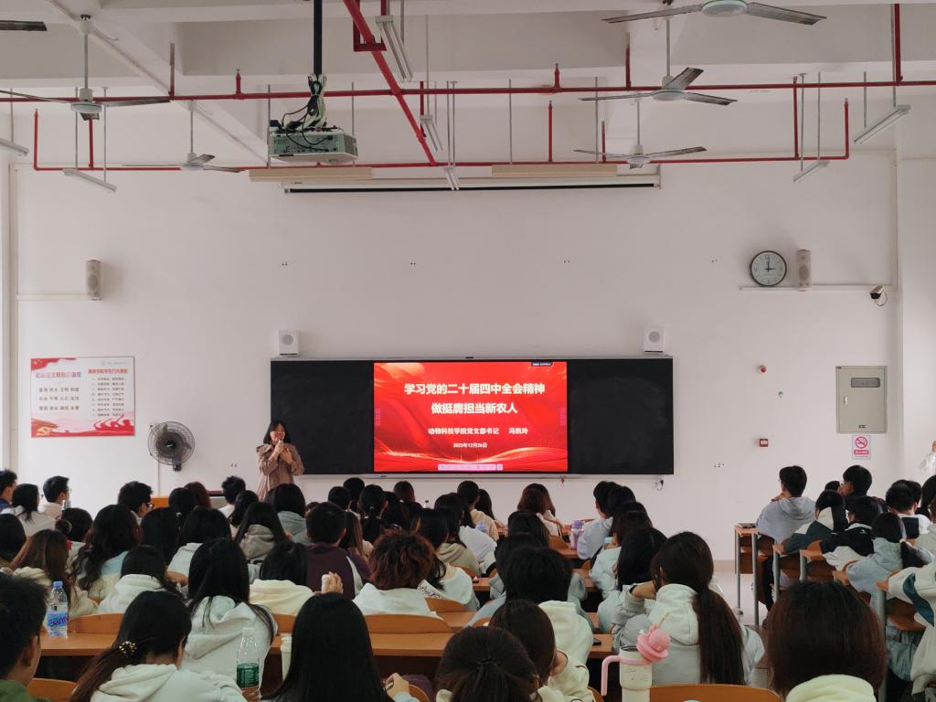 为深入学习贯彻党的二十届四中全会精神,引导学生党员准确把握全会核心要义,推动全会精神落地生根,2025年12月26日下午,动物科技学院党支部书记冯凯玲以《学习党的二十届四中全会精神 做挺膺担当新农人》为主题,为学院150余名学生入党积极分子和入团积极分子讲授专题党课,激励青年学子在农业现代化建设中勇担使命、逐梦前行。