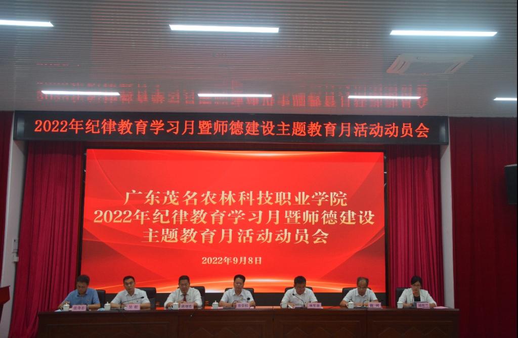 9月8日下午,广东茂名农林科技职业学院召开2022年纪律教育学习月暨师德建设主题教育月活动动员会。学院党委书记董荣权、院长林里泉、党委专职副书记陈旭东、副院长陈列、副院长吴松、纪委书记刘育兰、院长助理张奇志等参加了会议,参加会议的还有全体党员以及学院教师代表。会议由院长林里泉同志主持会议。