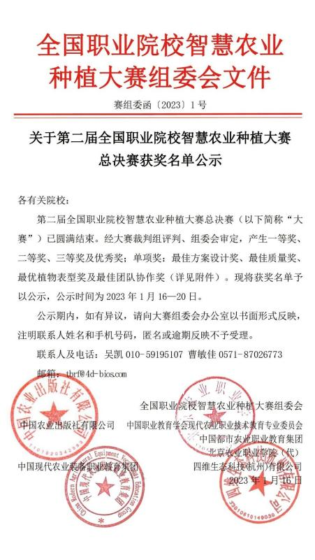 近日,第二届全国职业院校智慧农业种植大赛总决赛圆满落幕。我校生物技术系朱启明和滕丽丽老师指导现代农业技术2102班学生黄志远、林芯爱和园艺技术2101班学生程嘉慧组队积极参赛,在“智慧叶菜种植大赛”总决赛中荣获三等奖。
