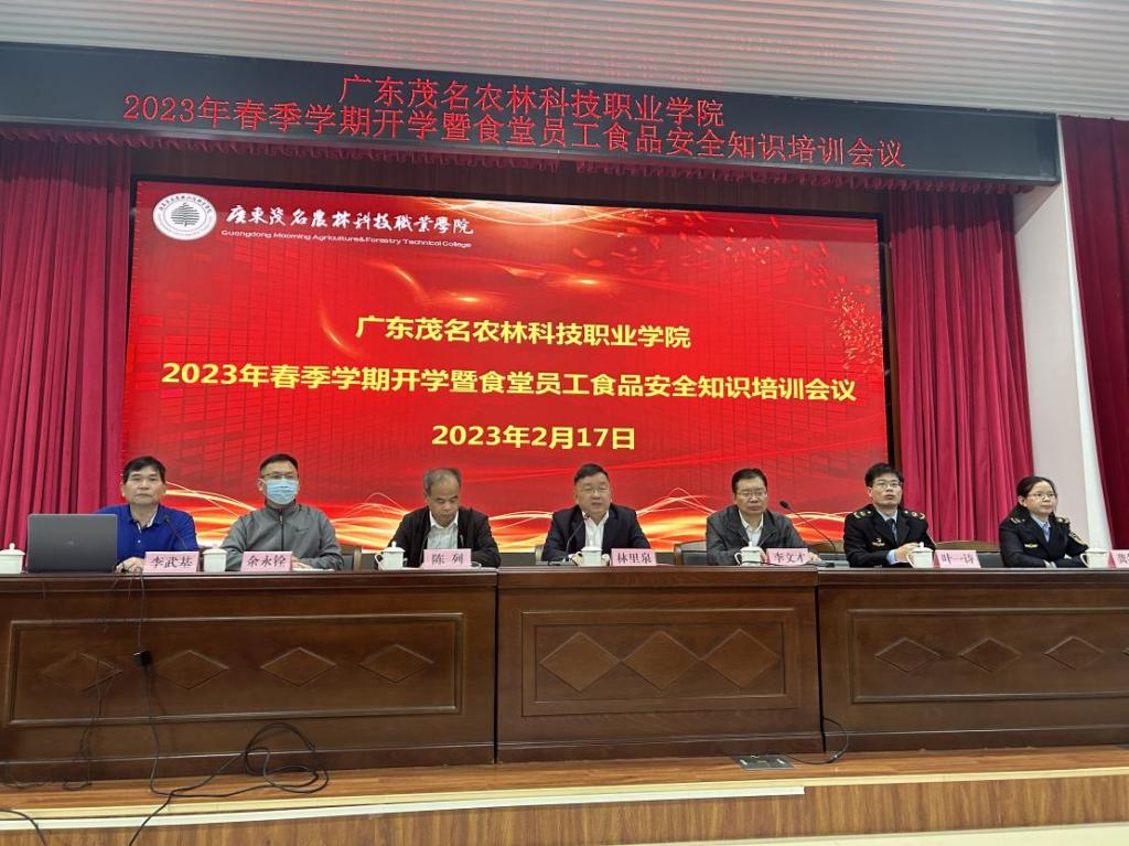 为压实食品安全管理主体责任,规范学校食品安全管理水平,增强食品安全从业人员的安全意识,2月17日,我校在行政培训楼一楼开展2023年春季学期开学暨食堂员工食品安全知识培训会议。茂名市市场监督管理局四级调研员李文才、茂南区市场监督管理局公馆市场监督管理所一级科员叶一诗、公馆市场监督管理所龚冬梅同志到校指导,学院领导林里泉、陈列出席活动,后勤保卫部负责同志及食堂、商店全体员工等共167人参加培训活动。