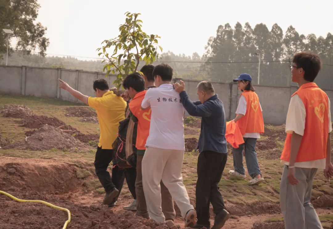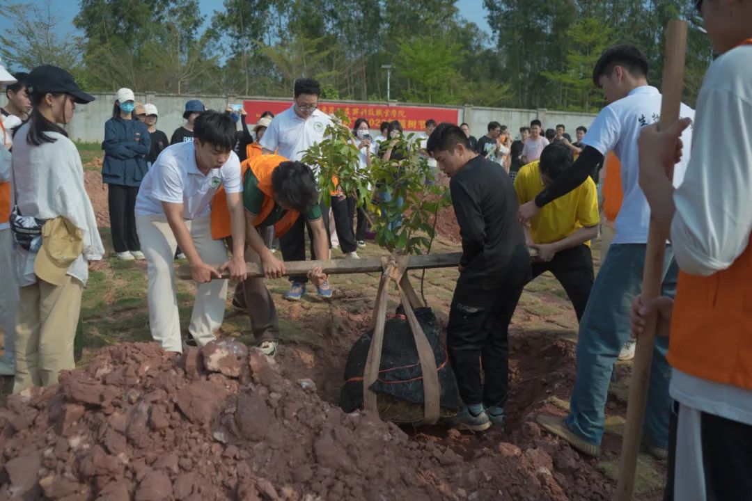植树现场师生们扛起铁锹,铲土填坑,扶树浇水,使得一株株新苗迎风挺立,相信在不久后的将来,他们就能成为农林一隅的墨绿,为绿色农林再添一抹希望与生机。