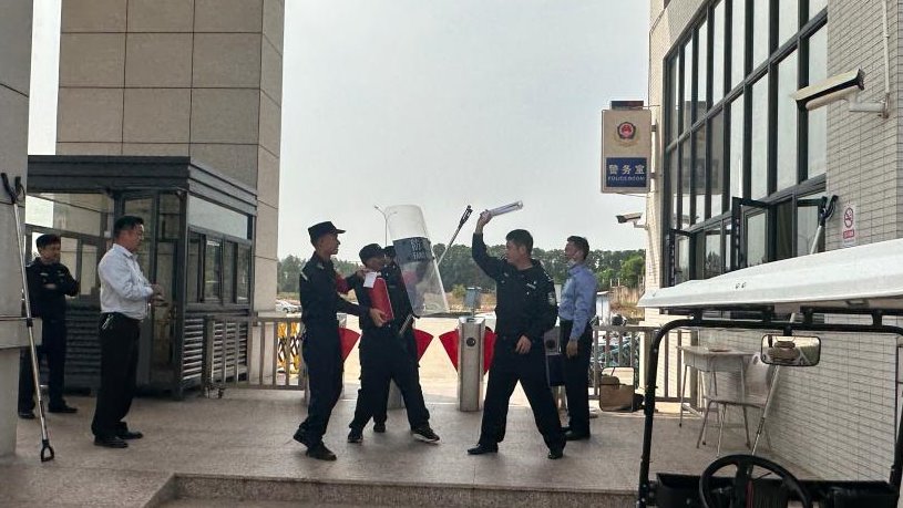 讲座结束后,市区两级反恐部门领导到学校门岗和危化品室开展反恐宣传和检查工作,并通过模拟场景指导安保人员开展反恐袭击演练活动。