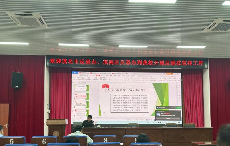 反恐宣传是保障国家政治安全和社会大局安全稳定的重要举措,是反恐工作的治本之策。为进一步增强我校师生识恐、防恐的意识,提高识恐、防恐和应对恐怖活动的能力,达到普及反恐法律知识,加强反恐宣传教育,3月16日上午,茂名市和茂南区两级反恐部门领导走进我校,召开反恐法宣传专题讲座,检查反恐工作落实情况,开展反恐袭击演练活动。