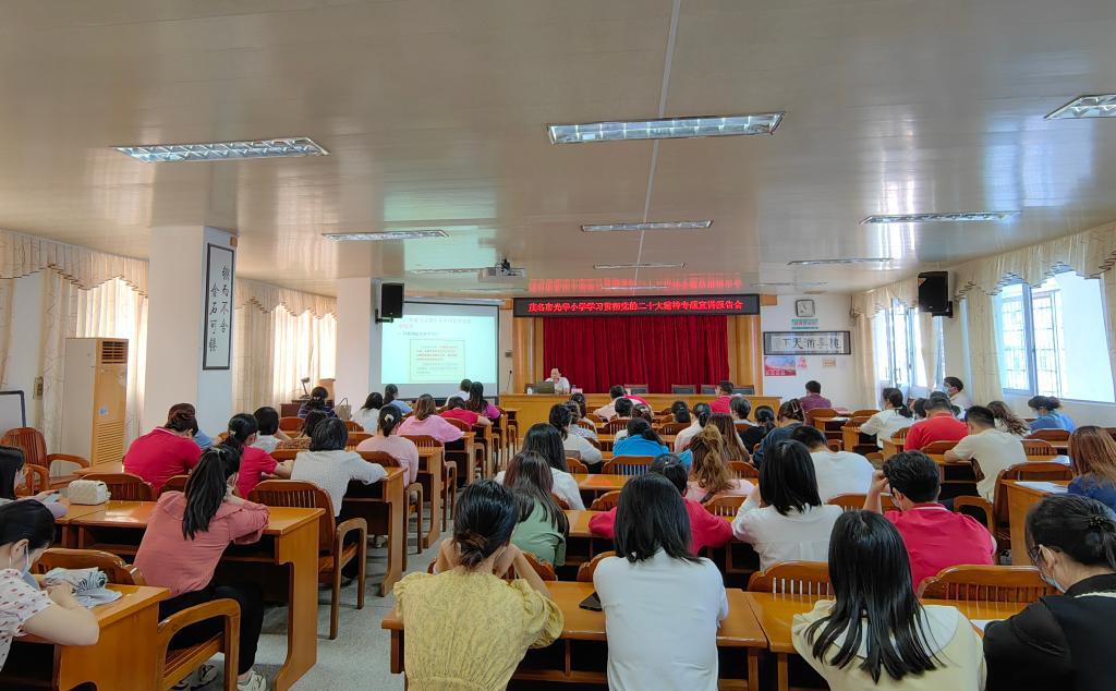 为深入学习宣传贯彻党的二十大精神,准确把握党的二十大精神实质和丰富内涵,将其转化为指导实践推进学校工作的强大动力,2023年5月15日上午,市委教育工委宣讲团成员、广东茂名农林科技职业学院马克思主义学院负责人、政治高级讲师余绍标同志应邀到茂名市光华小学开展教职员工学习贯彻党的二十大精神专题宣讲会。宣讲会由光华小学陈贞校长主持,学校全体教职员工参加。
