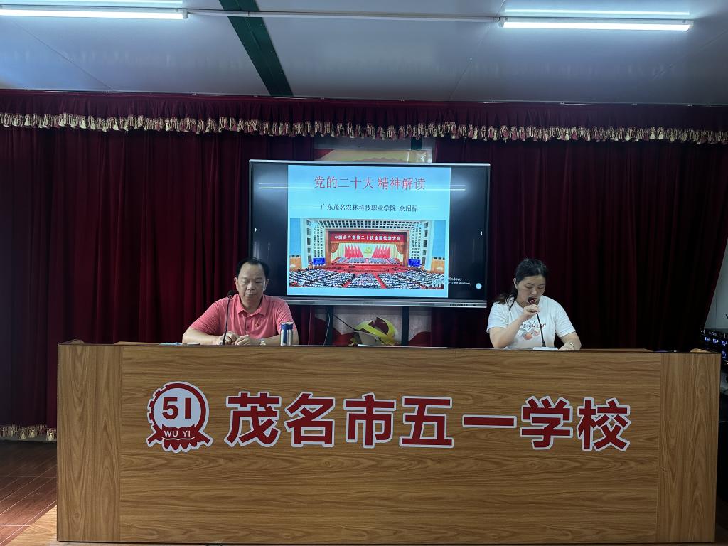 为深入学习领会党的二十大精神,增强党的创新理论学习宣传的感召力、凝聚力、影响力,让党的二十大精神在广大师生中落地生根、开花结果。2023年5月26日上午,市委教育工委宣讲团成员、我校马克思主义学院负责人、政治高级讲师余绍标同志应邀到茂名市五一学校开展学习贯彻党的二十大精神专题宣讲会。宣讲会由茂名市五一学校第二党支部书记戴燕琼主持,学校党员教师、教职员工参加了本次宣讲活动。