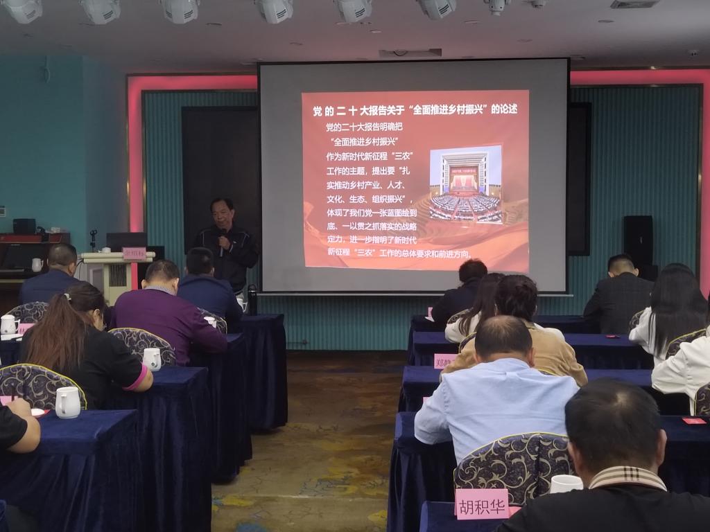 为深入学习贯彻党的二十大精神,用马克思主义中国化最新成果武装头脑,以高质高效的服务助力乡村振兴。2023年11月16日-11月19日,肇庆市广宁县洲仔镇镇村干部一行20余人到茂名市开展为期四天的调研和培训。11月16日,我校马克思主义学院党支部书记、负责人余绍标受邀讲授专题党课,主题为学习党的二十大精神,行动践行“两个维护”。