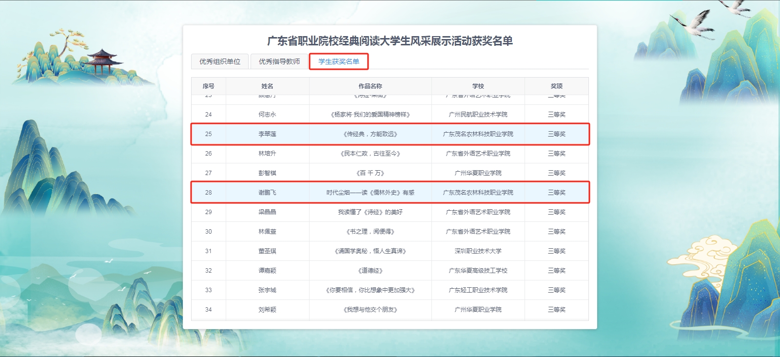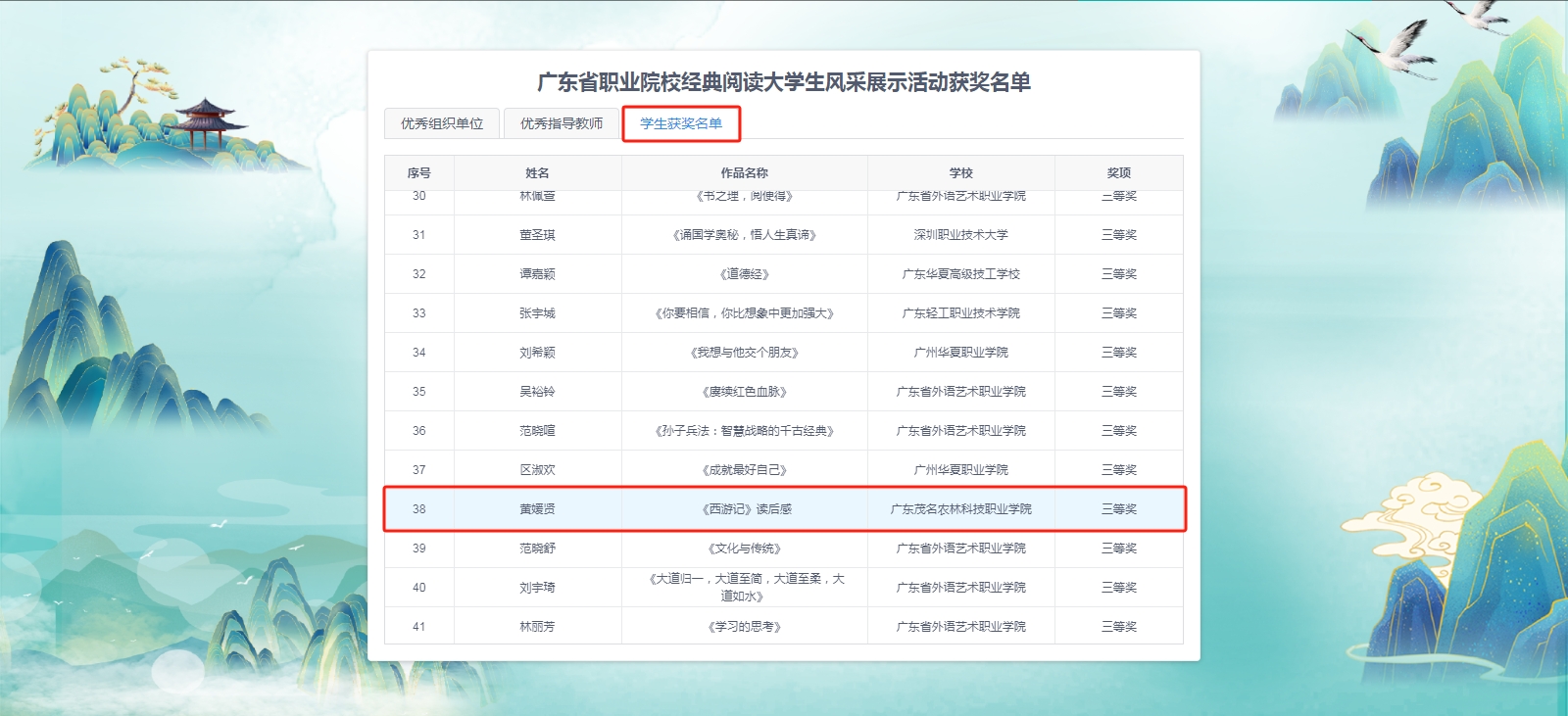 本次活动由广东省职业院校图书馆情报工作指导委员会主办,深圳职业技术学院图书馆承办,读者之星(天津)网络科技有限公司协办,广东省职业院校图书馆共同参与。我校图书馆积极响应活动号召,大力发动组织本校学生参加,荣获了“优秀组织单位”,我校食品工程系学生李翠莲的《传经典,方能致远》、动物科学系学生谢鹏飞的《时代尘烟——读〈儒林外史〉有感》和经济管理系学生黄媛贤的《〈西游记〉读后感》获得了三等奖。