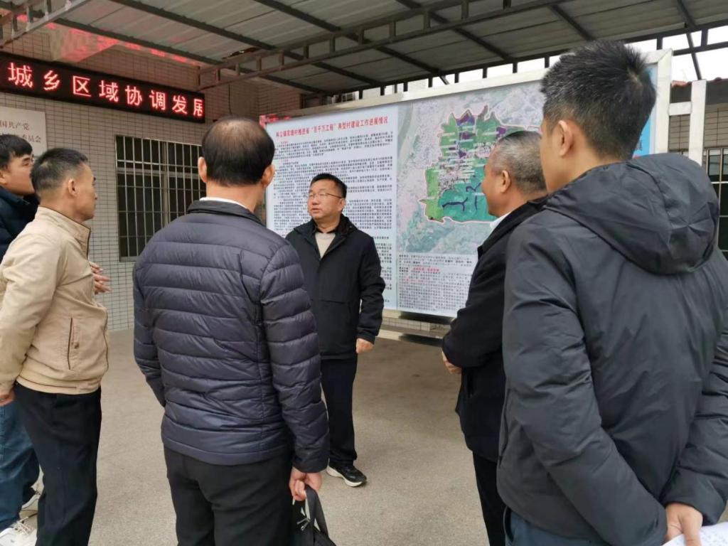 图三 林里泉一行在官塘村典型村建设总平面图前研讨