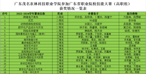 近日,由广东省教育厅主办的2023-2024学年广东省职业院校技能大赛各赛项均已落下帷幕。我院此前共组建了40支队伍参与35个赛项,经过奋勇拼搏,共获得学生组二等奖5项,三等奖13项,教师组奖项1项。