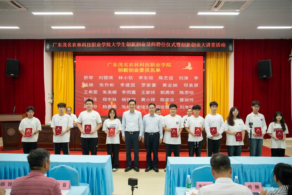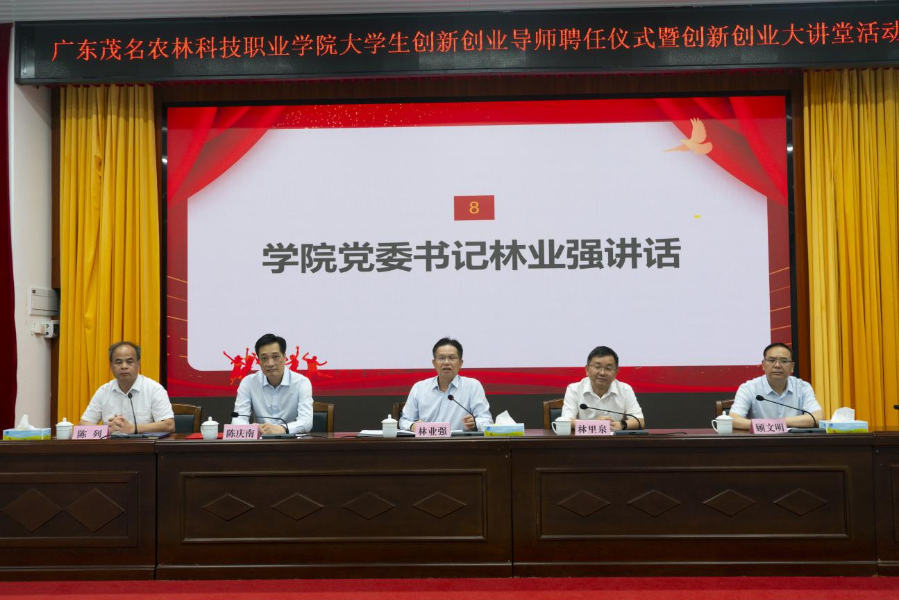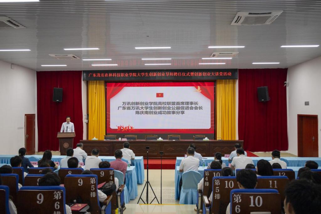 为进一步助推我院创新创业教育高质量发展,打造校内外、专兼职相结合的创新创业教育导师队伍,4月25日下午,学院在行政培训楼一楼大会议室举办大学生创新创业导师聘任仪式暨创新创业大讲堂活动。学院党委书记林业强出席仪式并讲话,万讯创新创业学院高校联盟首席理事长、广东省万讯大学生创新创业公益促进会会长陈庆南受聘为学院创新创业导师,学院党委副书记、院长林里泉为其颁发聘书。仪式由学院党委委员、副院长陈列主持。万讯高校联盟顾文明、谢积贵,茂名墟产业振兴协会秘书长杨燕妮,学院相关职能部门负责人、全体辅导员、经济管理系全体教师、校团委学生组织代表及各班实践委员参加仪式。