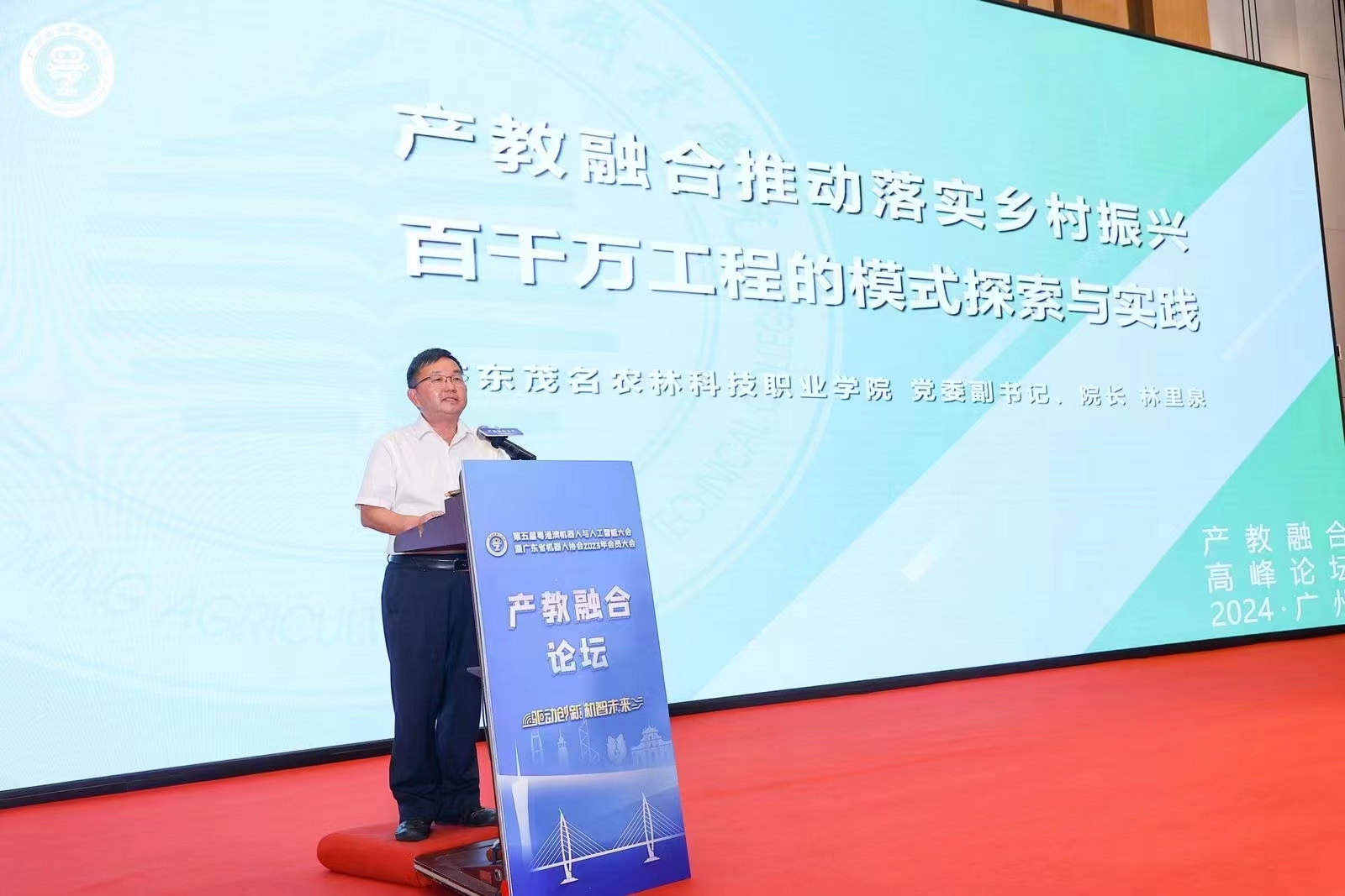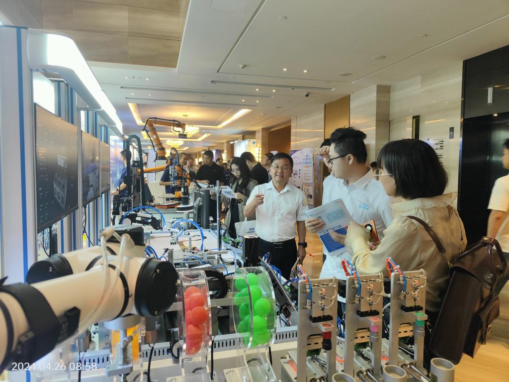 2024年4月26日,由中国电子商会机器人专委会、广东省机器人协会主办,广东诚飞智能科技有限公司承办的第五届粤港澳机器人与人工智能大会暨产教融合高峰论坛在广州举行。论坛以为“深化产教融合,发展新质生产力”为主题,邀请全国职业院校及技工院校领导、产教融合管理部门、教学管理部门、实训中心以及工业机器人、人工智能、智能制造、自动化等院系主管、专业群负责人、骨干教师参会,并特邀行业专家、相关企业负责人参加研讨活动,就共同推动产教融合、促进培养高质量人才、发展新质生产力进行深入交流研讨。受主办机构邀请,学院党委副书记、院长林里泉带领校企合作办公室副主任钟卫林、智能工程系机电技术教研室主任傅击浪参加活动。