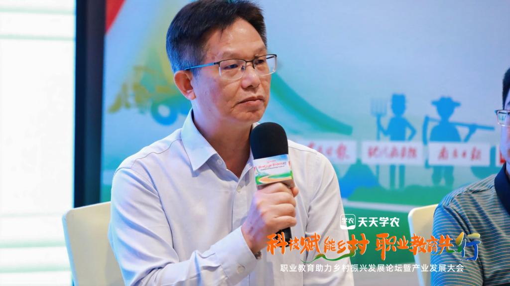 圆桌论坛上,林业强就农业职业教育如何助力乡村产业发展等问题提出实操性建议。林业强指出,首先要将农业职业教育融入地方经济发展。近年来广茂农林职院紧紧围绕茂名特色农业产业“五棵树一条鱼一桌菜”持续发力,选派专业骨干为驻村第一书记,科技特派员深入田间地头传授沉香、橘红、荔枝种植新技术,组建电商直播团队为农户买荔枝、三华李等特色农产品,真正做到了把论文写在大地上。其次,从人才培养方面,农业职业教育应重点培养高素质农民。学院自办学以来,累计为广东省培养输送农业类毕业生5267人。学院作为省级高素质农民培育基地,近年来开展农业类培训169期13725人,大力培养高素质农民,助力农业产业发展。同时,学院坚持校政企合作,深入推动“百千万工程”高质量发展,实实在在做出了一些项目,如鱼虾混养项目,切实帮助渔农每季创收近万元,《沉香主要病虫害防治技术规程》《罗非鱼鱼冻加工技术规范》和《吉富罗非鱼与鲫鱼混养技术规范》等获批地方标准项目立项。