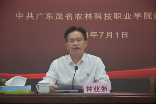 林业强在讲话中,满怀深情地回顾了中国共产党成立103年以来带领中国人民实现国家富强、民族振兴、人民幸福的波澜壮阔的光辉历程。林业强指出,学院处于弯道超车的机遇期,全校要以辩证思维看待新发展阶段的新机遇和新挑战,直面困难、破解难题,努力把学院第一次党员大会确定的高质量发展蓝图转化为发展实效。他要求,要坚定理想信念,进一步深刻领悟“两个确立”的决定性意义,不断增强“四个意识”,坚定“四个自信”,做到“两个维护”。要聚焦重点任务,牢记立德树人根本任务,建设现代农林牧渔特色鲜明,食品、经贸、人工智能等学科均衡发展的高水平应用科技大学。要坚持师生为本,不断提升基层治理水平,汇聚学院高质量发展的强大合力。要全面从严治党,持续营造风清气正的政治生态和良好的育人环境。