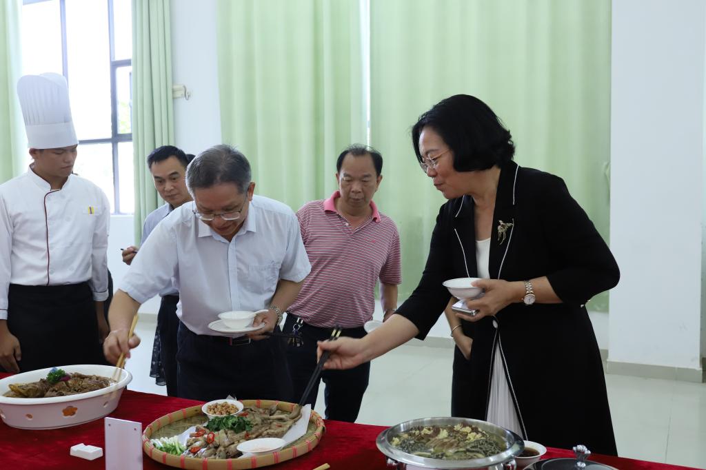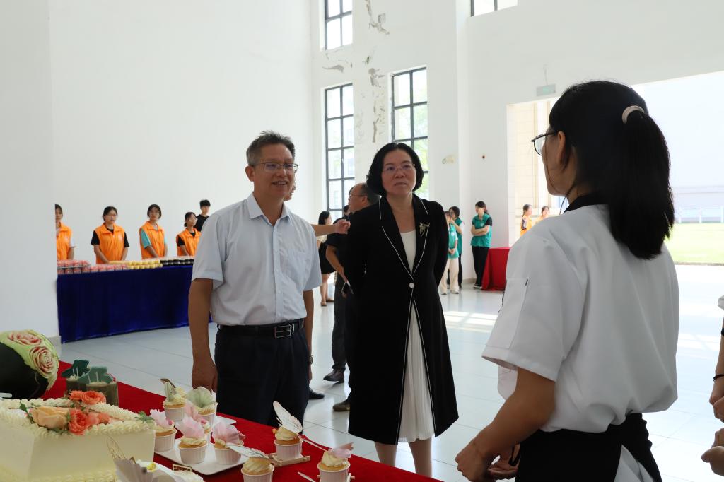 茂名白切土鸡、簸箕盐擦鹅、白灼水东芥菜、电城鱼炸蚝炸、窦州杨桃鸭……10月21日,我院实训楼E一改往日的宁静,变成了热闹异常的“美食楼”,处处弥漫着诱人的香气。学院食品工程系携手广州半岛投资集团、太钟餐饮集团等知名餐饮企业,举办首届高凉菜校园美食节。现场眼花缭乱、大饱眼福,既为师生带来了一场茂名人的味蕾记忆,又展现了“好心茂名”的乡愁、乡韵和文化。学院党委书记林业强,学院党委副书记、院长董艳清等学院领导及各部门师生近千人其乐融融,共赴高凉盛宴。