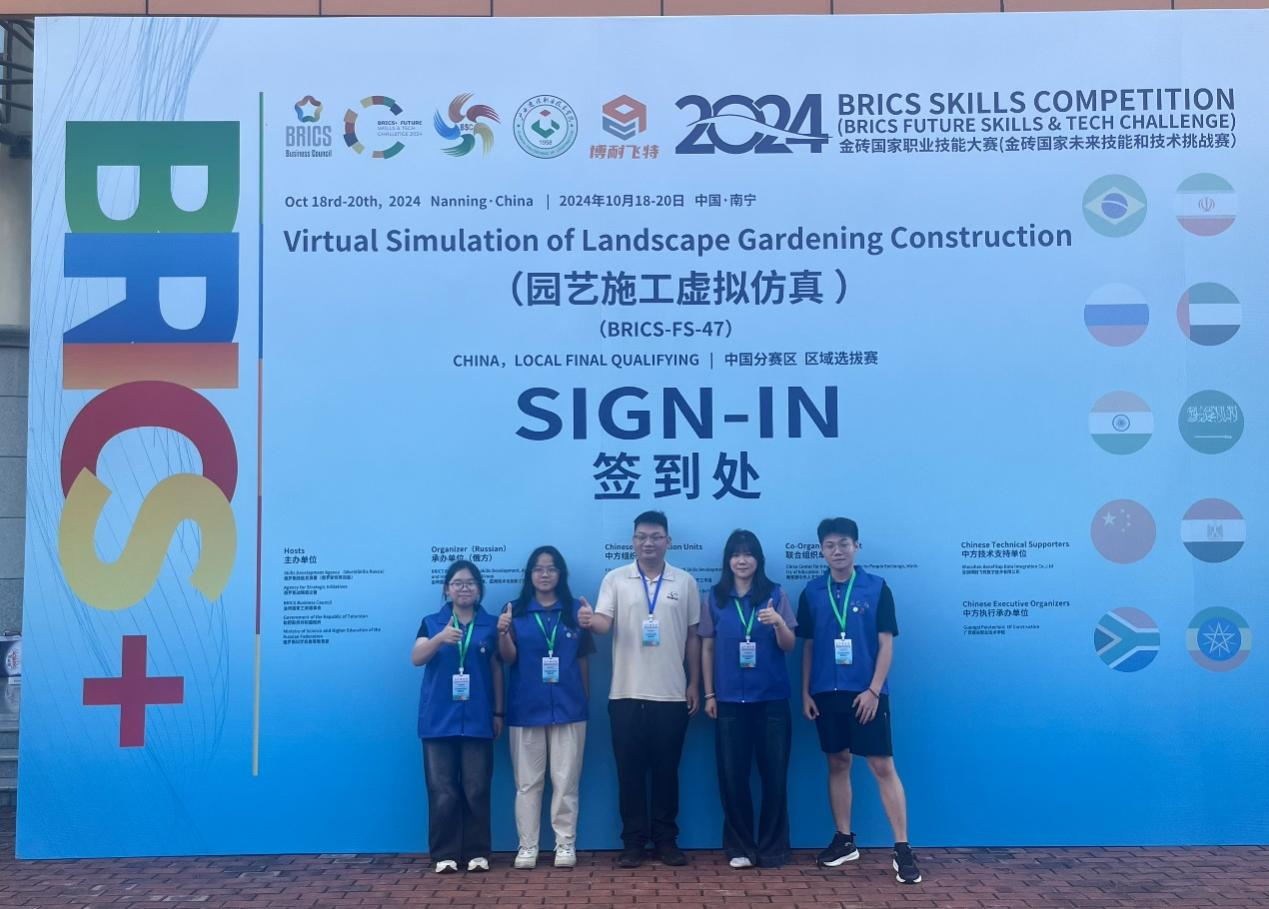 2024年10月18日至20日,2024金砖国家职业技能大赛(以下简称“金砖大赛”)园艺施工虚拟仿真赛项选拔赛(线下赛)在广西建设职业技术学院举行。我院园林工程系师生团队以总分第五名的成绩斩获线下区域选拔赛一等奖。