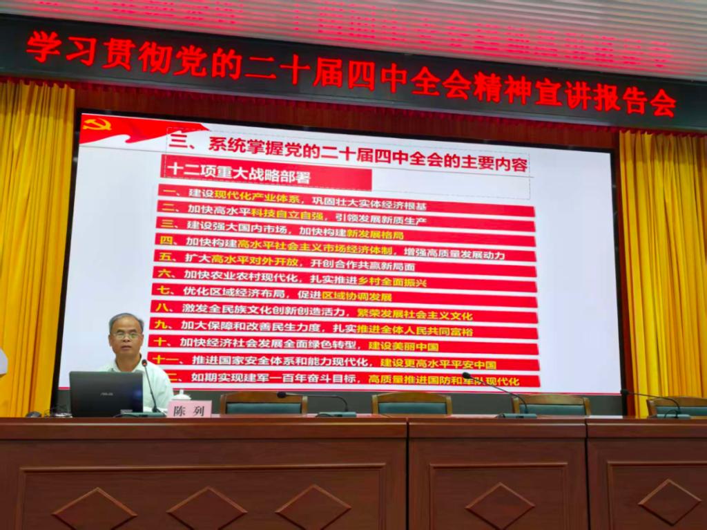 12月5日,学校党委专职副书记陈列以“深入学习贯彻党的二十届四中全会精神”为主题,面向校院两级优秀团学干部、各二级学院优秀“青马班”学员开展专题宣讲。