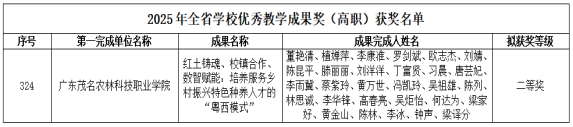 近日,广东省教育厅发布2025年全省学校优秀教学成果奖(职业教育)获奖名单,我校董艳清校长牵头申报的教学成果《红土铸魂、校镇合作、数智赋能:培养服务乡村振兴特色种养人才的“粤西模式”》喜获二等奖,实现了学校在该奖项上的历史性突破。