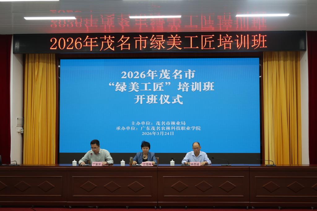 3月24日,由茂名市林业局主办、广东茂名农林科技职业学院承办的 2026 年茂名市 “绿美工匠” 培训班在我校顺利开班。本次培训紧扣绿美广东、绿美茂名生态建设部署,为市、县、镇三级乡村绿化技术骨干搭建专业学习平台,全面提升乡村绿化技术指导与服务保障水平,助力乡村全面振兴和“百千万工程” 落地见效。开班仪式由我校继续教育学院负责同志主持。市林业局四级调研员江雪梅同志和我校党委委员、副校长林思诚同志在主席台就坐并讲话。