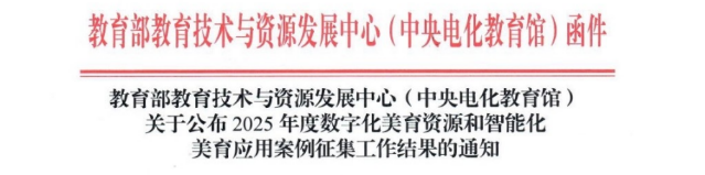 近日,教育部教育技术与资源发展中心(中央电化教育馆)公布2025年度数字化美育资源和智能化美育应用案例征集结果,我校申报的艺术活动资源《数字技术驱动下的美育助力乡村振兴成果展示》成功入选,即将上线国家中小学智慧教育平台美育板块,面向全国师生开放共享。