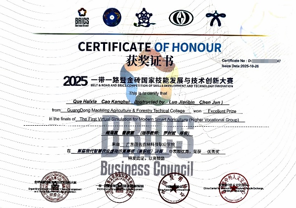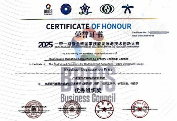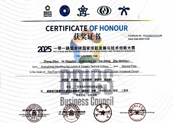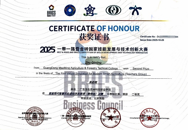 2025年10月24日,2025一带一路暨金砖国家技能发展与技术创新大赛——首届智慧农业虚拟仿真赛项全国总决赛在山东枣庄职业学院正式拉开帷幕。本次大赛汇聚了来自全国23个省、自治区、直辖市的300支参赛队伍,涵盖本科组、高职组、中职组和教师组,竞争激烈。经过多轮角逐,我校师生凭借扎实的专业知识、娴熟的虚拟仿真操作能力和出色的团队协作精神,在高职组和教师组中表现优异,斩获多项荣誉。现代农业学院学生郑子洛、叶莹颖获得二等奖,阙海霞、曹康慧获得优秀奖;指导教师蔡紫玲、朱启明荣获“优秀指导教师”称号;朱启明在教师组比赛中荣获二等奖。凭借出色的整体表现,我校还被授予“优秀组织奖”。
