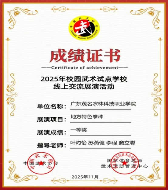 近日,由国家体育总局武术运动管理中心主办的2025年校园武术试点学校线上交流展演活动中,我校学子表现卓越,其展演的“地方特色拳种”项目在全国1010所参赛学校中脱颖而出,荣获该项目一等奖,展现了学院深厚的体育文化底蕴和强大的竞争力。