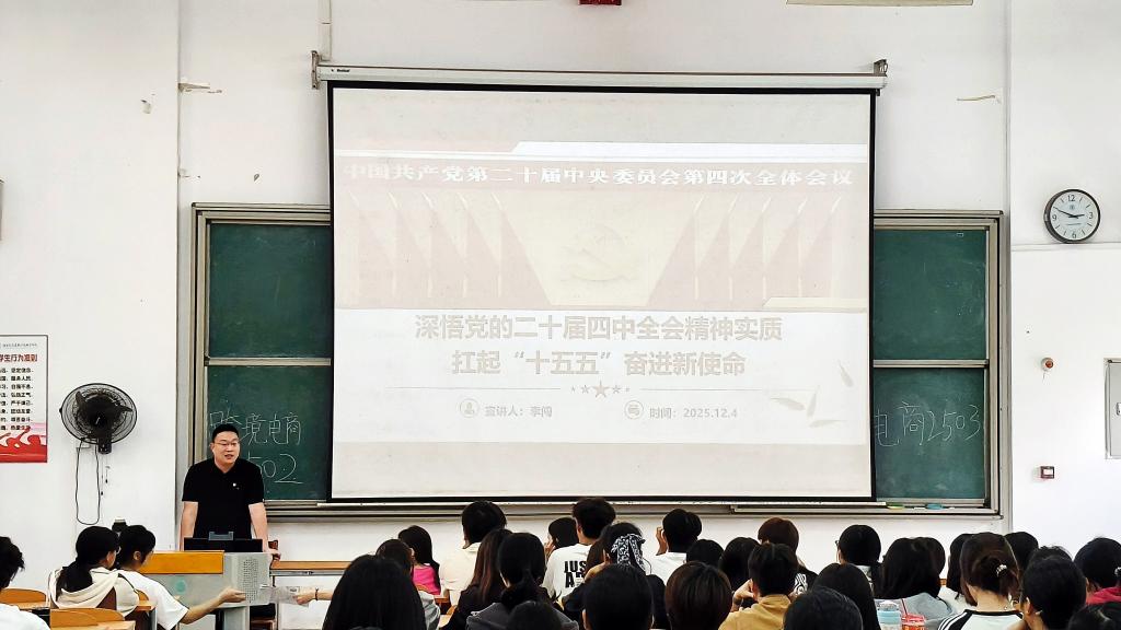 宣讲中,李闯同志紧扣全会公报核心内容,从三个维度进行系统阐释:一是深入解读党的二十届四中全会的核心要义,重点阐明全会在“十四五”收官、“十五五”谋划关键节点召开的重大历史意义,强调要深刻领悟“两个确立”的决定性意义;二是系统回顾“十四五”时期我国经济社会发展的历史性成就,结合经济领域数据与案例,展现我国经济实力、科技实力、综合国力跃上新台阶的生动实践;三是精准剖析“十五五”规划编制的深层逻辑,围绕高质量发展主题、新质生产力培育、现代化产业体系建设等关键部署,解读规划背后的战略考量。宣讲内容兼具理论高度与实践深度,特别结合经济管理专业特色,让全会精神与学科发展紧密相连。