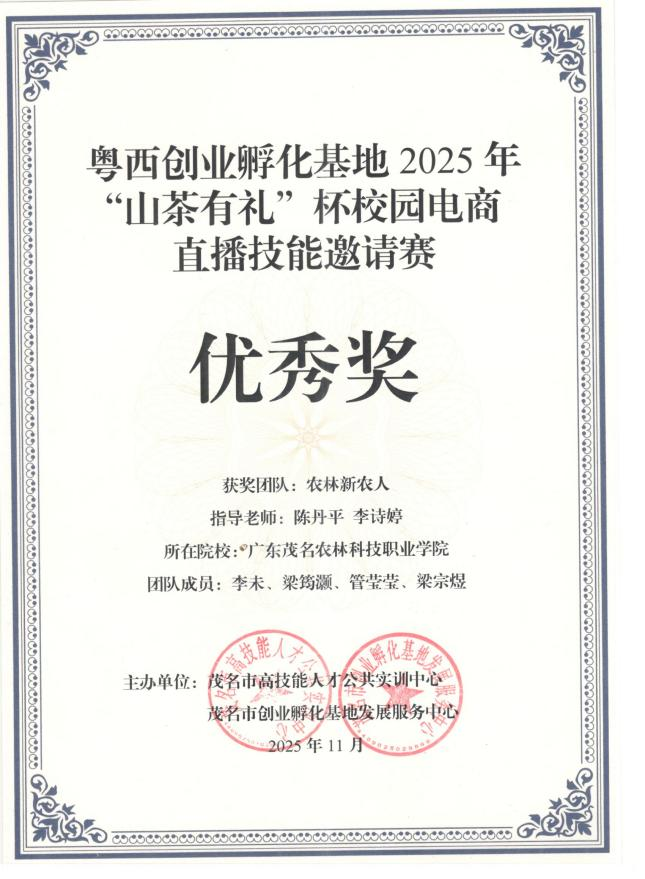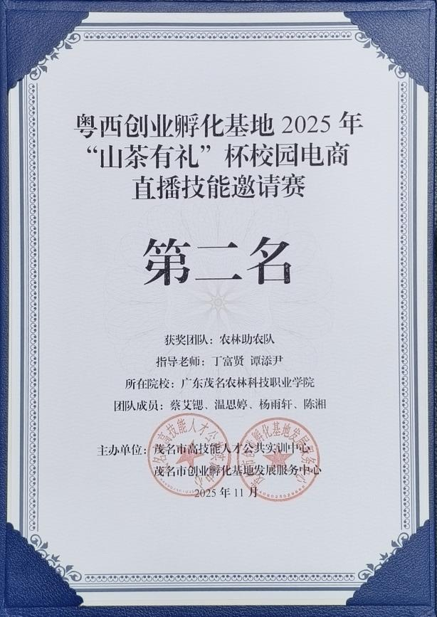 近日,由茂名市高技能人才公共实训中心主办的 2025 年“山茶有礼”杯校园电商直播技能邀请赛圆满落幕。我院“农林助农队”“农林新农人队”两支参赛队伍与茂名市十九支参赛队伍同台竞技,最终凭借扎实的专业技能与亮眼的实战成果,分别斩获二等奖与优秀奖,在茂名市多所高校、技工院校的同台比拼中展现了我院产教融合的育人成效。